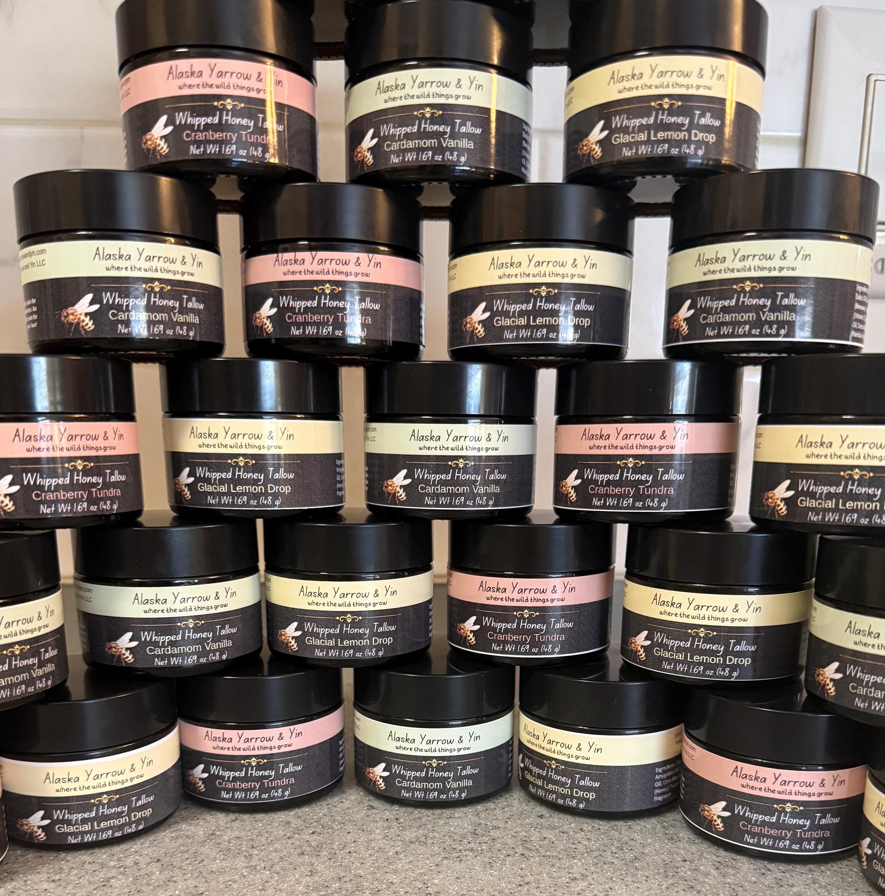 Available in Unscented, Cranberry, Deep Blue Heat, Lavender-Chamomile, Sugared Lemon Zest and our newest addition; coffee-infused tallow from our Caffeinated Caribou Collection. This Tallow is infused with dark coffee beans roasted right here in Alaska by Cold Snap LLC; caffeinated happiness for your skin!
