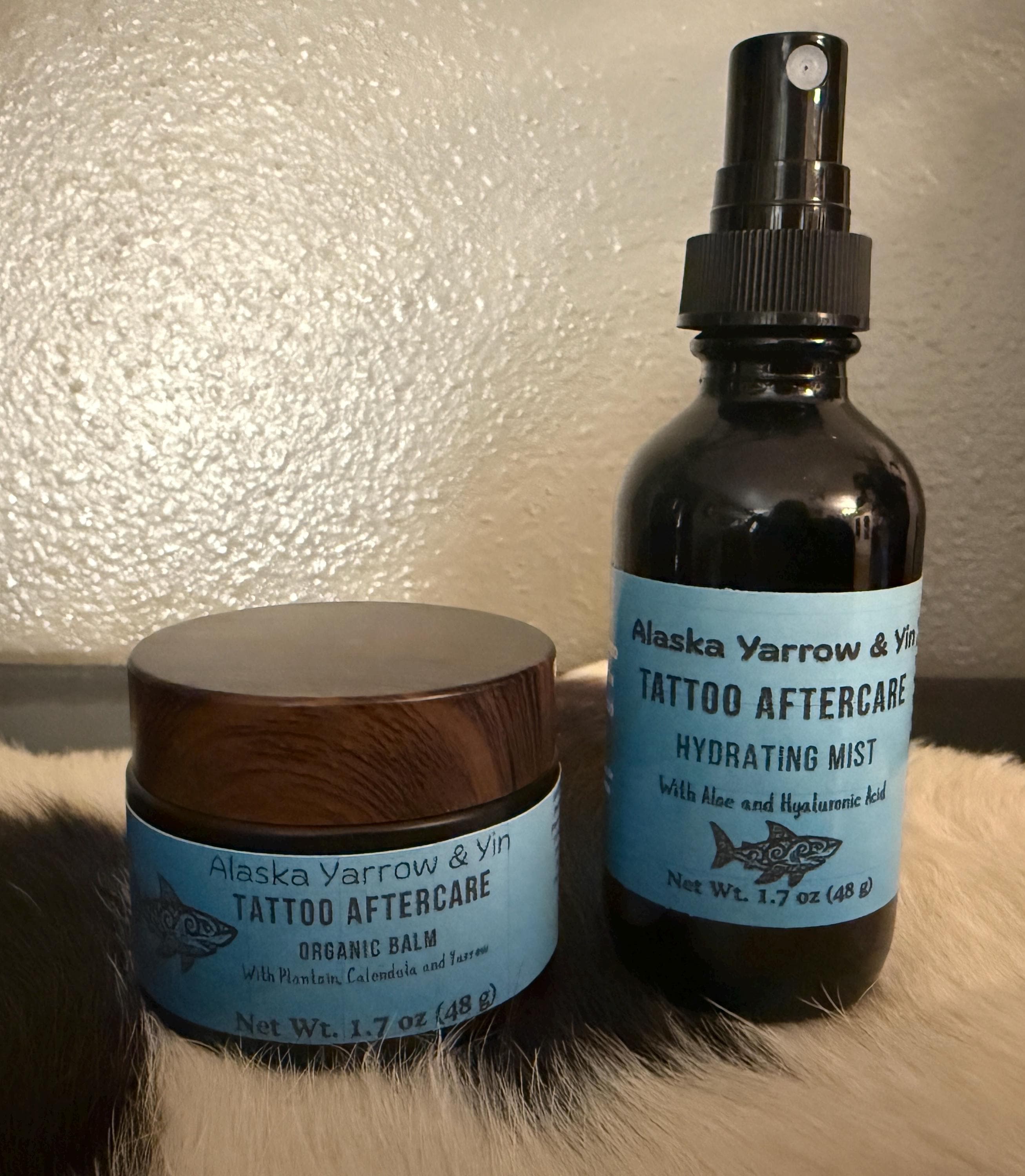 Plant-Based Natural Tattoo Care Set: Contains 1.7 oz Hydrating mist and 1.7 oz Balm in glass vessels.